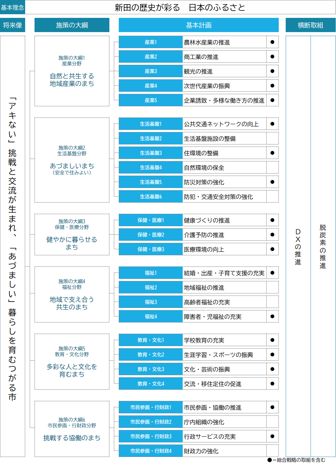 将来に向けたまちづくりの基本理念や施策の大綱を定め、総合的かつ計画的な市政運営を行うための指針となる市の最上位計画です。